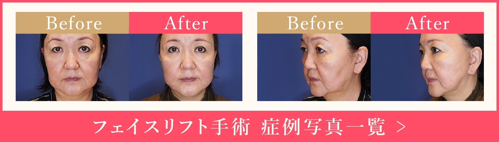 | 施術の説明 | フルフェイスリフトは、老けた印象を与えるシワやたるみなど、顔全体のエイジングサインを改善するための手術です。手術では、髪の生え際や耳の周りなど目立ちにくい部分を切開し、その部分にテンションをかけ、皮膚や筋肉を引き上げて固定します。顔全体がぐっと引き上がることでお肌にハリが出るのはもちろん、毛穴も目立ちにくくなり、若々しい印象を得られます。 |