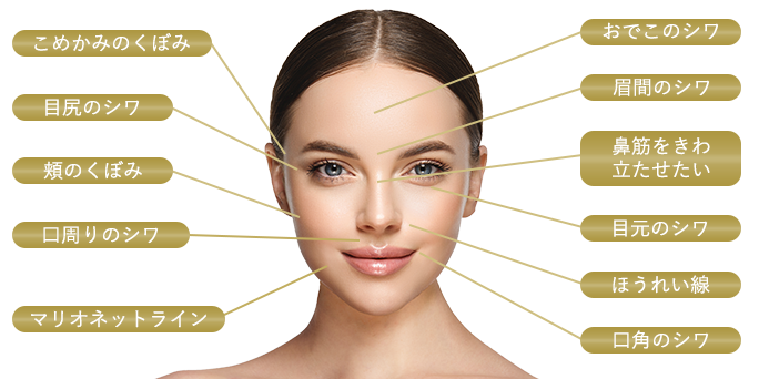 額・眉間・頬・ほうれい線・口の周り・マリオネットライン・おとがい部・アゴ