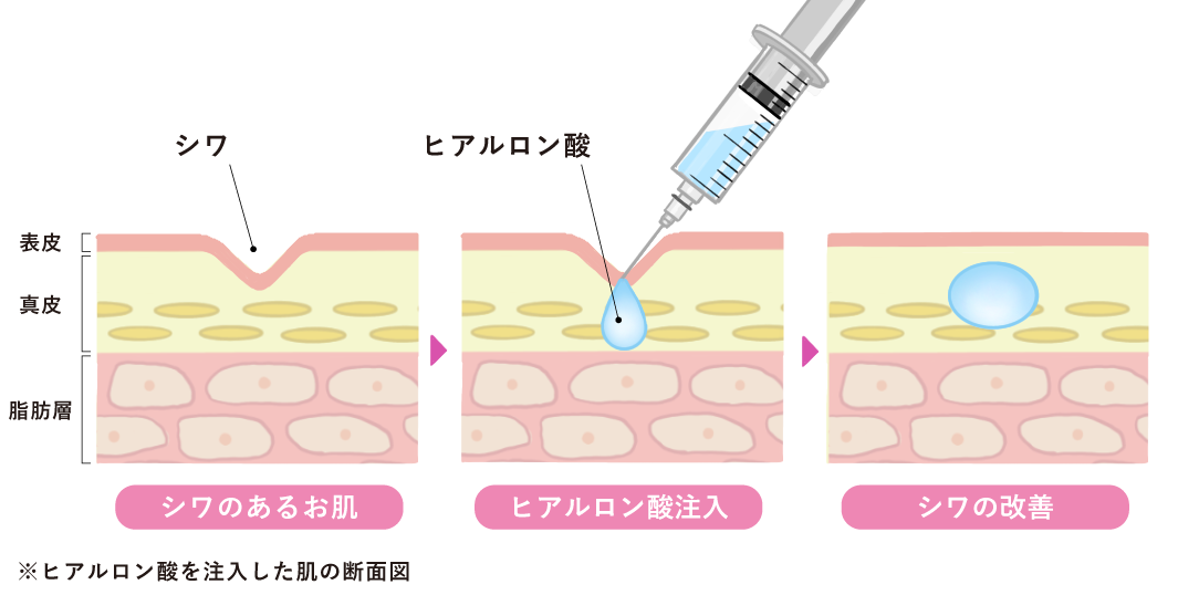 年齢とともにお肌の弾力(ハリ)が無くなってくると、お肌の表面にはシワが目立つようになります。この深いシワが出来ている部分にヒアルロン酸を注入すると、たくさんの水分を維持するようになります。すると、内側からお肌を持ち上げる状態になるため、シワが目立たなくなります。