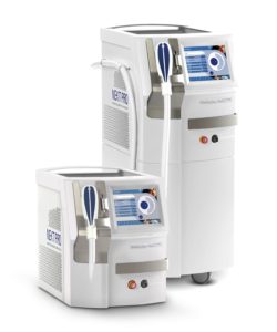 一方、メディオスターNext PROは蓄熱式です。毛根よりも浅い層にあるバルジ領域に低出力のレーザーを照射し、じわじわ熱を加えていく方法です。ハンドピースに内蔵されたダイオードに電流を流すことで、808nmこれらの2つの波長をうまく組み合わせることにより、さまざまな脱毛が可能となります。