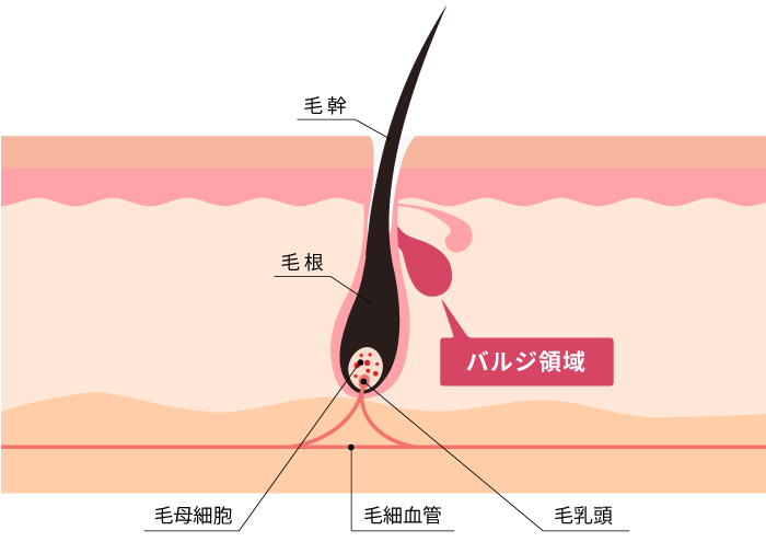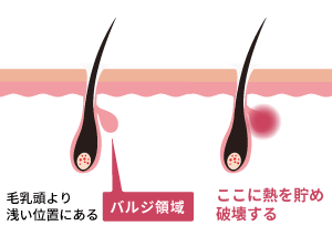 毛根に栄養を与えるバルジを破壊すると毛が成長できなくなるため、毛根にある毛母細胞を破壊しなくても、永久脱毛が可能となります。