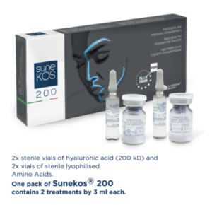 スネコスは非架橋ヒアルロン酸と6種類のアミノ酸が配合された新しい製剤です。非架橋ヒアルロン酸とは保水力の優れたサラッとしたヒアルロン酸の事で、柔らかい為にシワをもちあげたり、顔の形状を形成する事はできませんが、皮膚にみずみずしさを与え、コラーゲンを新生します。また、アミノ酸を加える事でヒアルロン酸単体より、コラーゲン・エラスチンの再生が促進され、肌の再生、ハリ・弾力・ツヤの改善に高い効果が期待できます。