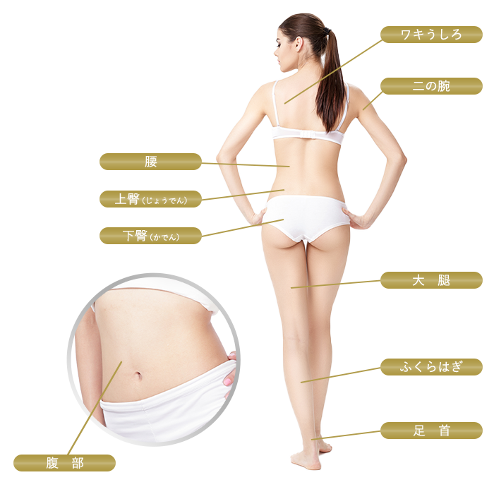 おなか周りや、二の腕、背中、太もも、ふくらはぎ、足首など、気になる個所に注入することで脂肪を溶かし、部分痩せ効果が期待できます。
